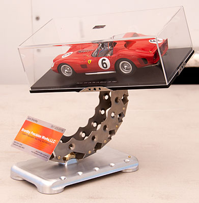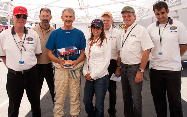 Rebecca Hale-Evans of Historic Grand Prix presents the 2011 Koni Heritage Award to Chris Bender.