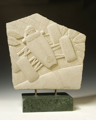 The award is an original work by Karen Heyl. Her award winning limestone mural carvings have received regional and national recognition. Karen works include monolithic shapes carved in the round, one sided flat stones, sculptures in alabasters and marbles from Europe and the American Southwest. Karen works out of her studios in Cincinnati, Ohio and Escondido, California. We at KONI join Phil Harris in our sincere appreciation of Karen’s creativity and talent in capturing the essence of F1.