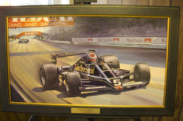 KONI commissioned artist Cortani to create a special award in the form of an original artwork depicting an F1 racecar and driver from this era. Cortani chose to portray a John Player Special Lotus 79 driven by Formula One Driving Champion Mario Andretti.